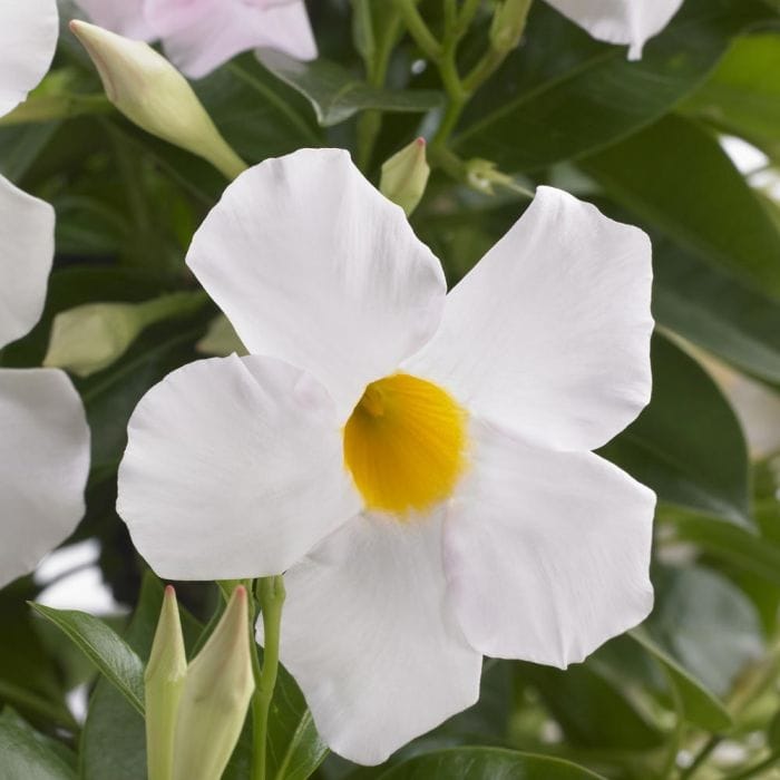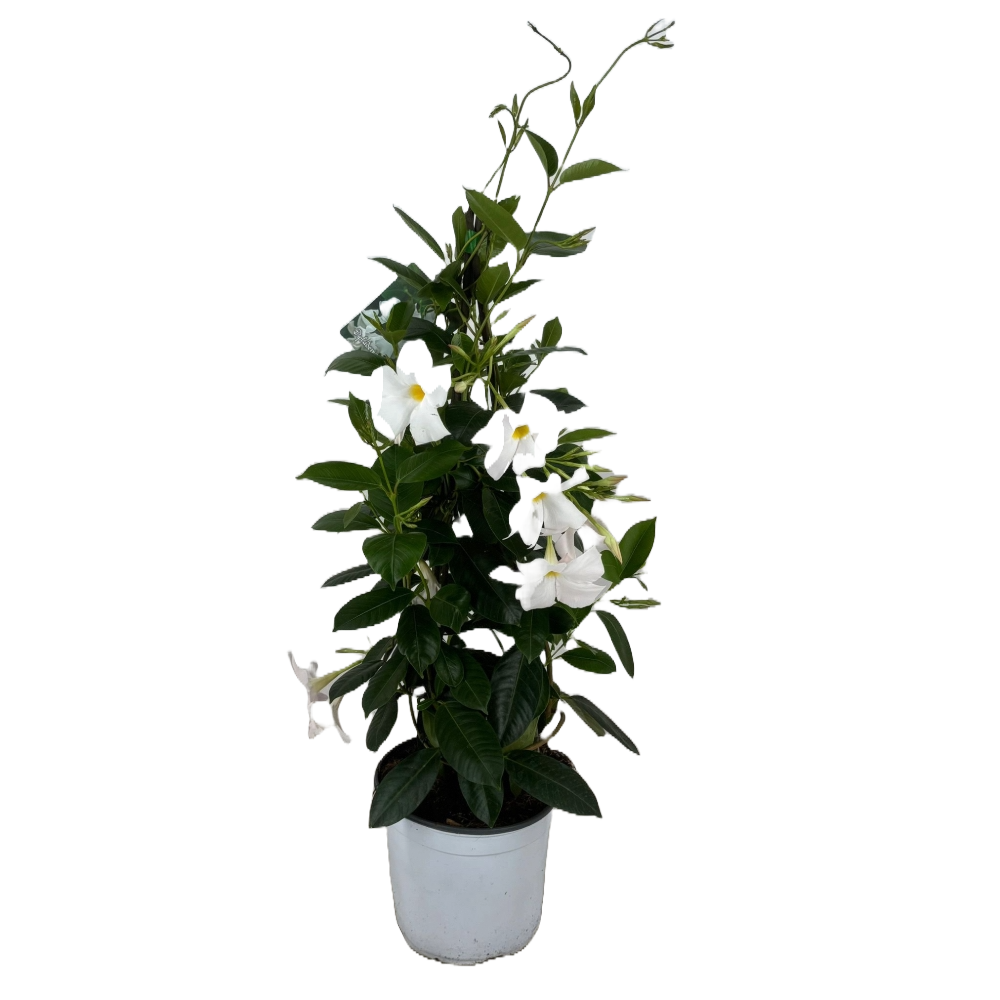 La Dipladenia, con i suoi fiori a trombetta dai colori vivaci (rosso, rosa, bianco), è perfetta per decorare balconi, terrazzi e giardini. Cresce in forma cespugliosa o rampicante, aggiungendo un tocco tropicale elegante.
