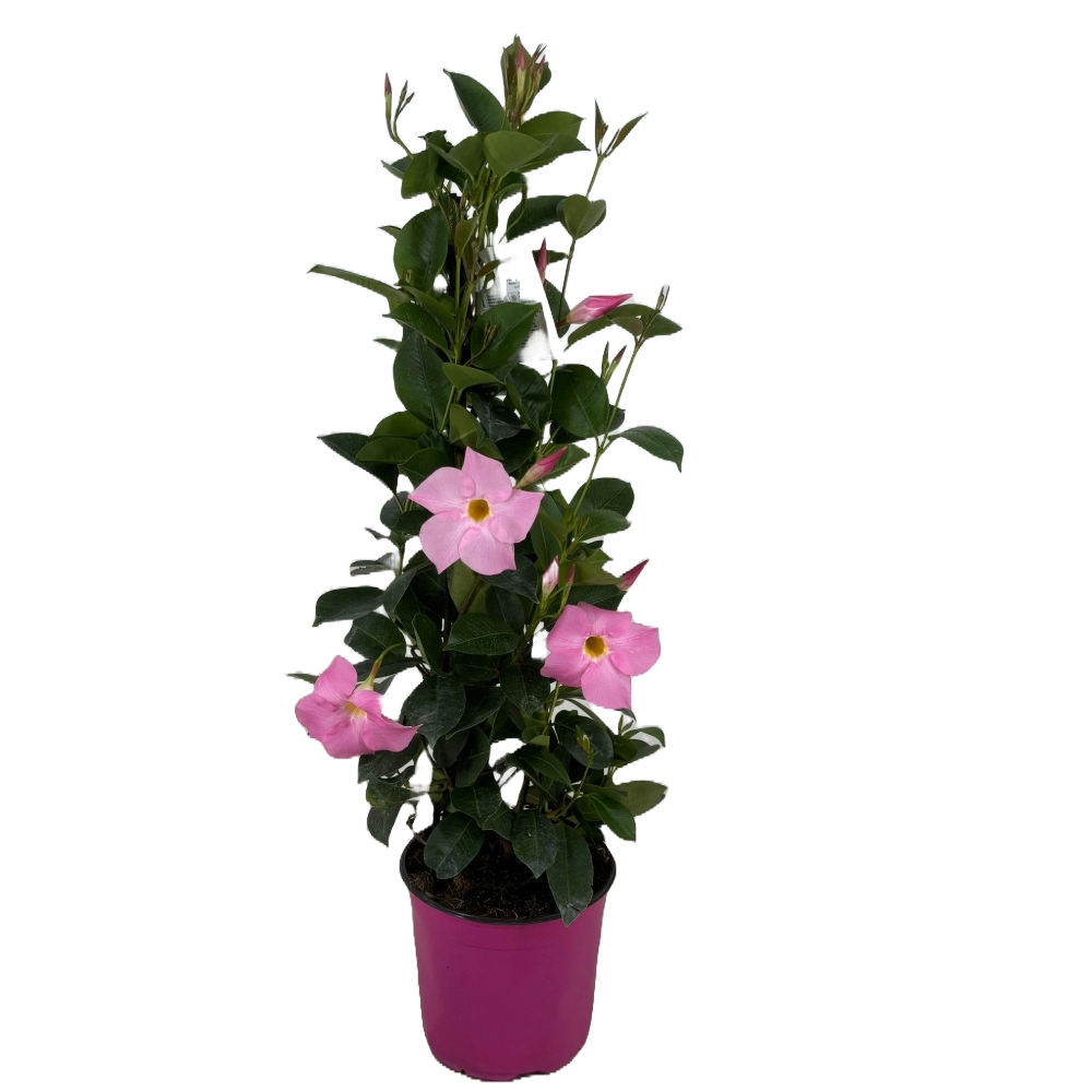 La Dipladenia, con i suoi fiori a trombetta dai colori vivaci (rosso, rosa, bianco), è perfetta per decorare balconi, terrazzi e giardini. Cresce in forma cespugliosa o rampicante, aggiungendo un tocco tropicale elegante.