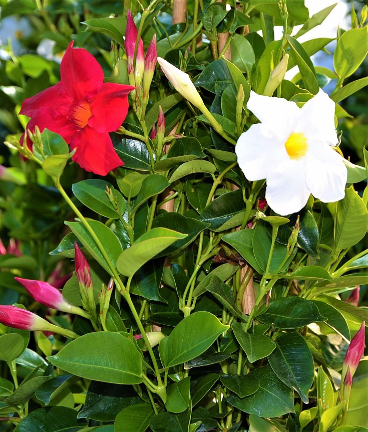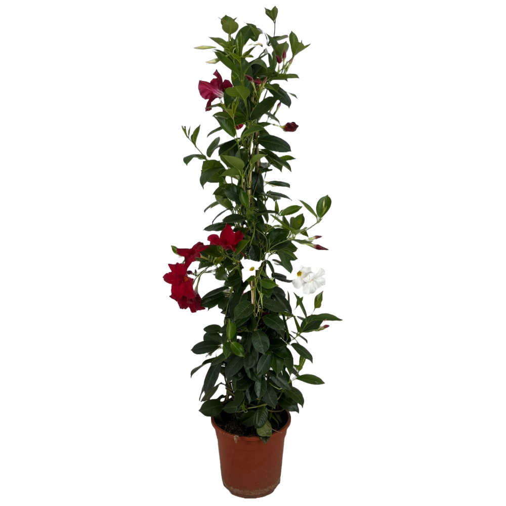 La Dipladenia, con i suoi fiori a trombetta dai colori vivaci (rosso, rosa, bianco), è perfetta per decorare balconi, terrazzi e giardini. Cresce in forma cespugliosa o rampicante, aggiungendo un tocco tropicale elegante.