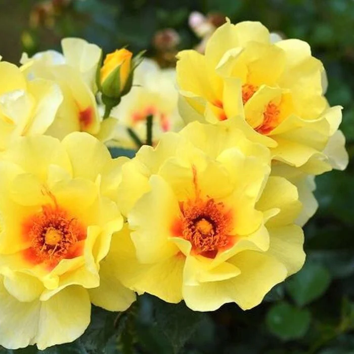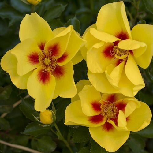 FranciaLa rosa Eyeconic produce è una rampicante dai fiori doppi di colore giallo intenso, con centro rosso vivo.